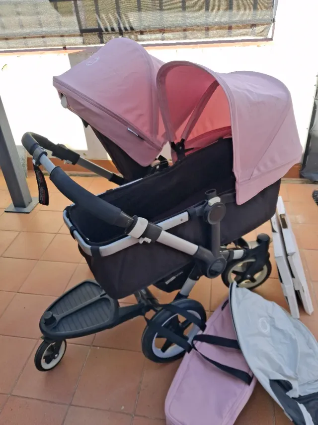 Detalles del productoSilla de paseo gemelar Bugaboo Donkey en color rosa. Ideal para dos niños. Son 2 sillas y un capazo.