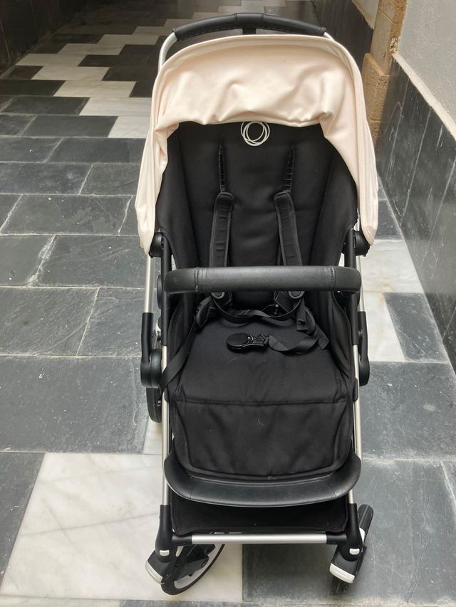 Bugaboo en color negro con capota beige y rosa - Chasis metálico. - Asiento acolchado. - Arnés de seguridad de 5 puntos. - Barra apoyabrazos. - Capota extensible.
