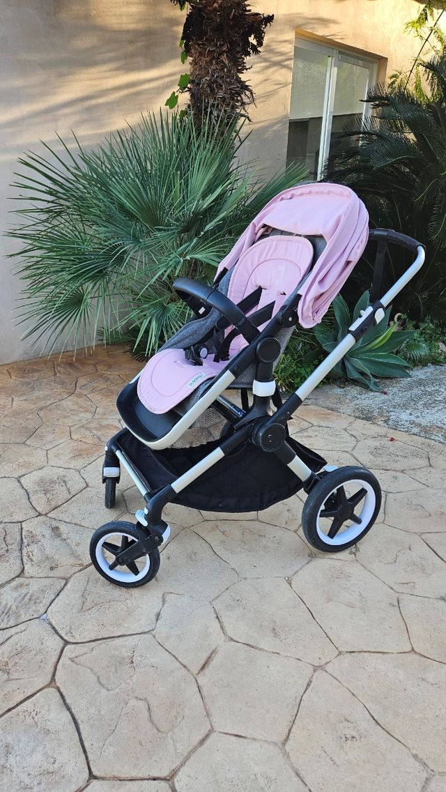 Detalles del productoCarro Bugaboo Fox 2 en color rosa y gris. Incluye silla y capazo (que se monta sobre el chasis devla sillita, por eso en la imagen aparece desmontado).
