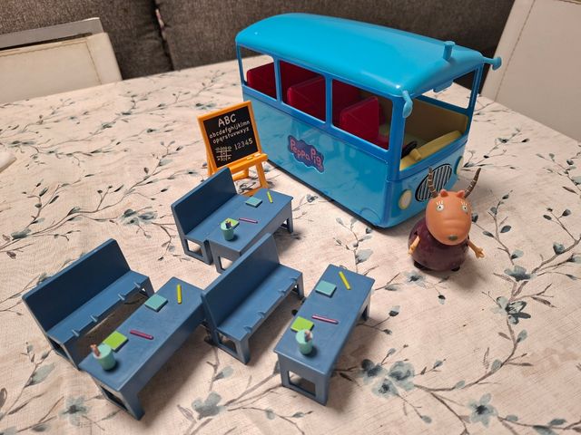 Detalles del productoPreciosa caravana-autobús escolar de Peppa Pig, ideal para jugar. Incluye un autobús azul en buenas condiciones. La escuela viene con 3 pupitres y sillas a juego, y una pizarra. ¡Perfecto para recrear las aventuras de Peppa! - Autobús escolar de plástico resistente. - 3 pupitres y sillas. - Pizarra con letras y números. Se vende con el personaje de Madame Gazelle. El autobús tiene sonido.