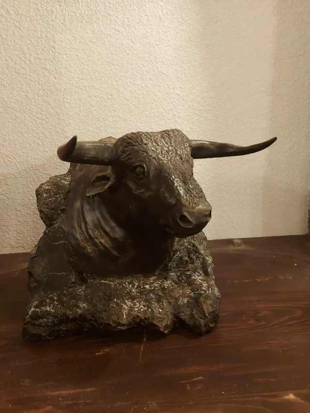 Impresionante busto de un toro con base de roca. - Detallado diseño del toro. - Base con textura de bronce