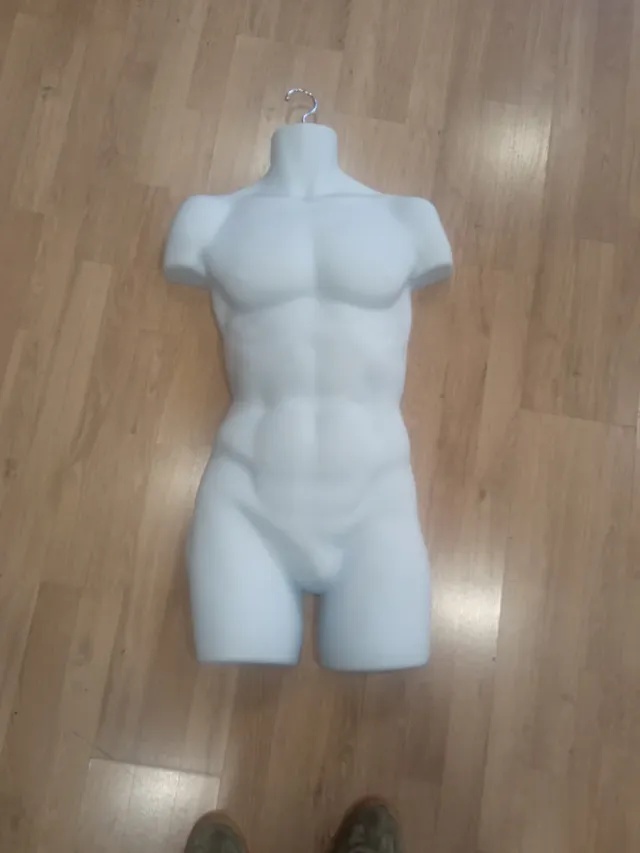Busto de maniquí para exhibición de ropa masculina. Ideal para tiendas o escaparates. - Diseño de torso masculino. - Color blanco. - Apto para colgar.