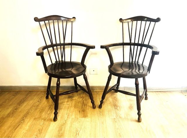 Detalles del productoPareja de butacas Windsor. Son de madera oscura y tienen un acabado pulido.