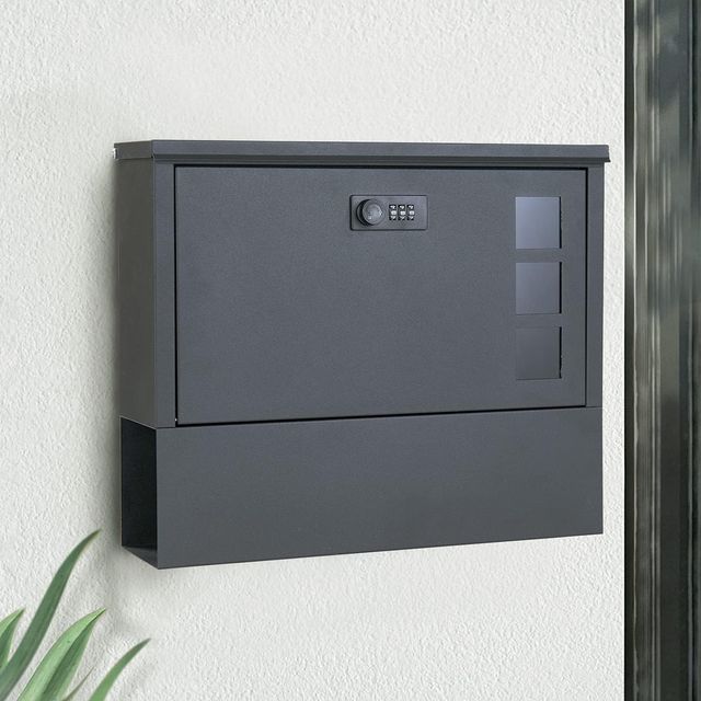 Detalles del productoBuzón MAITTON con cerradura de combinación - Buzón de pared negro con compartimento para periódicos de acero inoxidable, buzón moderno con ventana, con cerradura.