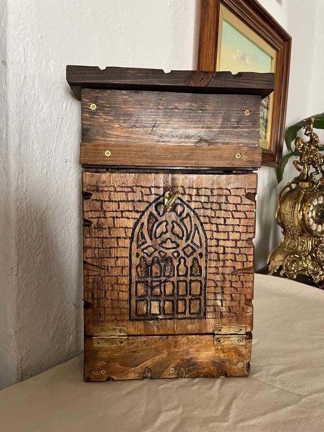 Detalles del productoBuzón de madera con un diseño rústico y detalles tallados.