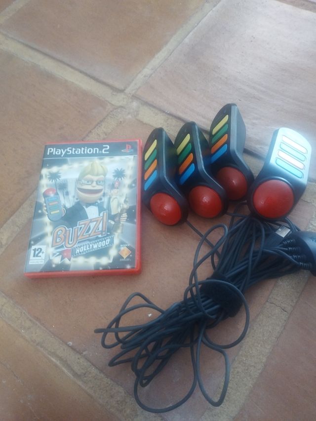 Detalles del productoJuego Buzz! Hollywood para PlayStation 2 en buen estado, junto con cuatro mandos.