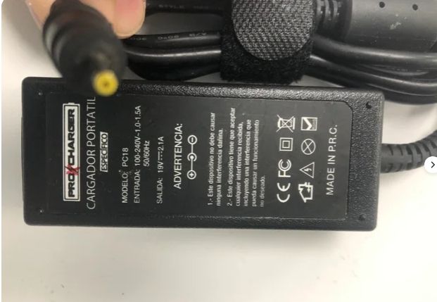 Adaptador de corriente para tablet PRO CHARGER. - Modelo: PC18 - Entrada: 100-240V, 50/60Hz - Salida: 19V, 2.1A - Fabricado en P.R.C.