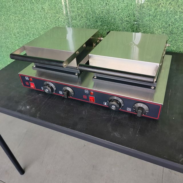 Gofrera Doble de Sobremesa Eléctrico con capacidad para 8 gofres. Acero inox + molde de hierro fundido. Temperatura regulable de 50 - 300º. Capa antiadherente. Peso: 24 Kg. Potencia: 4 Kw. Voltaje: 220 v