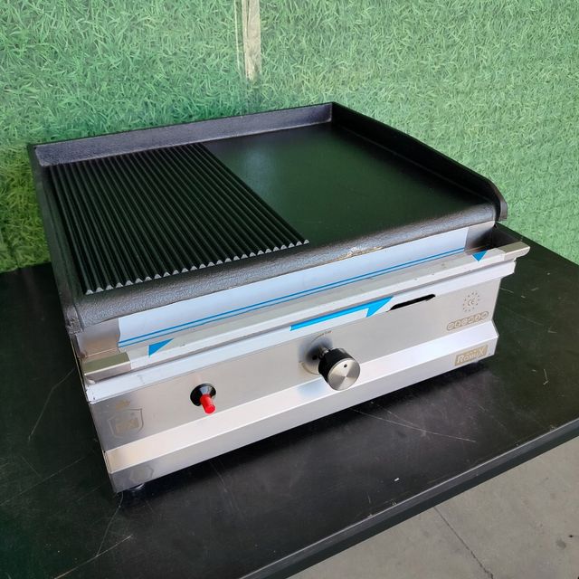 Plancha de Hierro Fundido con Placa Mitad Ranurada/ Mitad Lisa de 50 cm de ancho en modelo sobremesa Gas. Estructura de acero. Dimensiones Placa: 48x41 cm. Grosor Placa: 8 mm. Temperatura de 50-270 ºC. Cajón de recogida grasas. Peso: 25 kg. Potencia: 2,5 Kw.
