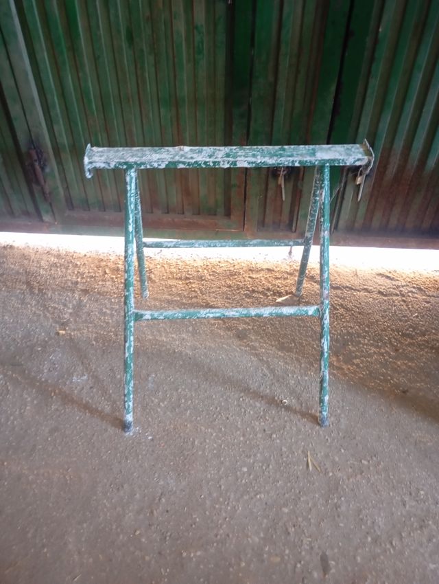 Detalles del productoCaballete metálico para trabajos de bricolaje o construcción. Ideal para sujetar materiales o herramientas. - Estructura de metal resistente. - Color verde, con marcas de uso. - Perfecto para pequeñas reparaciones. Mididas 0.67 de ancho 0.77 de alto