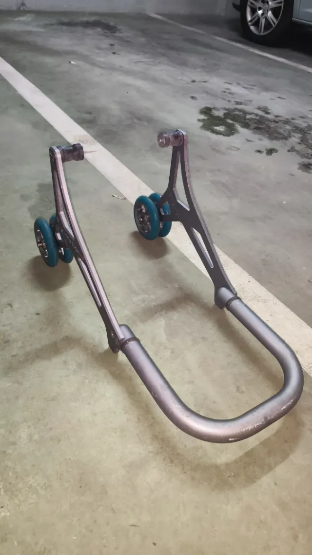 Detalles del productoCaballete para moto con ruedas para facilitar su movimiento. Ideal para mantenimiento o almacenamiento.