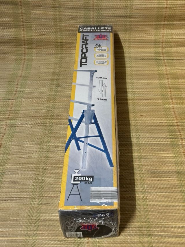 Vendo caballete de la marca Top Craft, completamente nuevo y en su embalaje original. Es plegable, extensible y de construcción resistente ("heavy duty"), ideal para trabajos de bricolaje o construcción. Soporta hasta 200 kg de peso y es ajustable en altura desde 79 cm hasta 130 cm. Incluye sistema de bloqueo de seguridad para mayor estabilidad.
