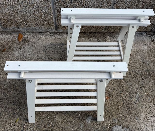 Detalles del productoVendo 2 caballetes de madera ajustables, color blanco, en buenas condiciones, sólidos y estables.
