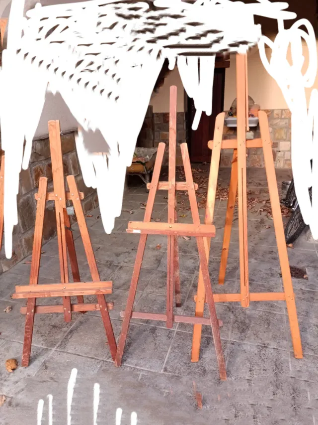 Tres caballete de madera para pintar , con algún desperfecto . - Material: Madera. - Color: Madera natural.