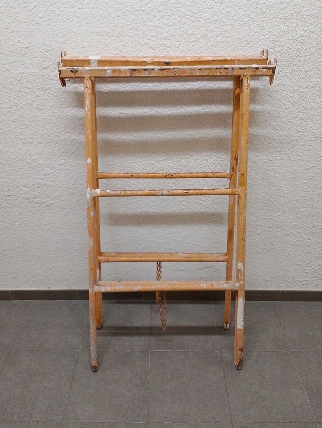 Par de caballetes metálicos de color naranja. Son robustos y fáciles de plegar. - Estructura de metal. - Barras de soporte. - Cadena de unión.