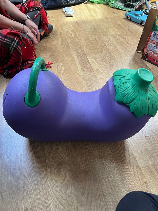 Detalles del productoCaballito mecedora de la marca Chicco con forma de berenjena. Es de color morado y verde.