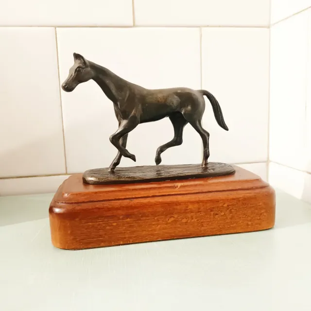 Elegante figura de caballo en bronce, con base de madera. - Detalle de firma en la pieza. - Diseño realista de caballo en movimiento.