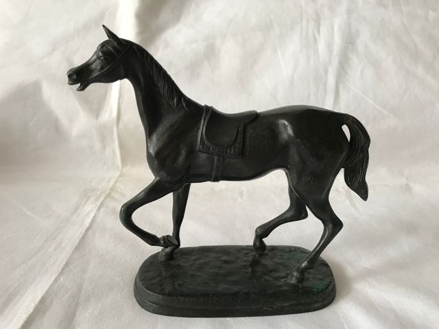 Detalles del productoFigura de un caballo en posición de paso español o trote. Es de metal fundido con pátina oscura. Mide 15,5 cm. de alto y 17 cm. de largo y pesa unos 900 gramos. Le falta una pequeña falta de material al principio de la cola (se ve en la última foto) el resto está bien. Muy elegante y decorativa, ideal para coleccionistas y amantes del arte ecuestre.