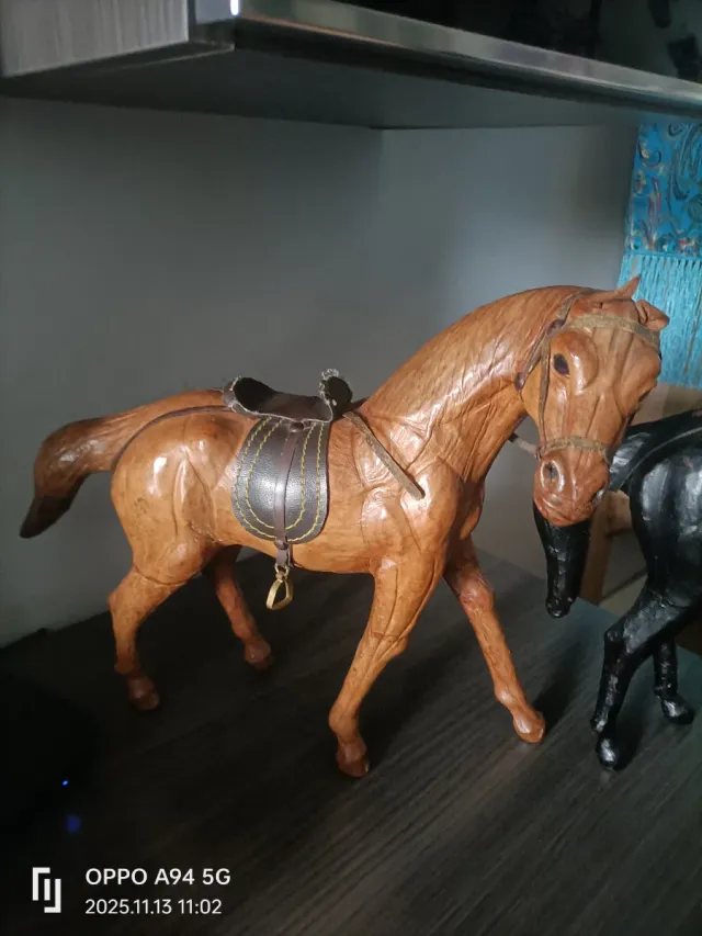 Figura decorativa de caballo con detalles en cuero. 32 alto x 35 ancho - Forrado en cuero marrón y negro. - Incluye silla de montar.