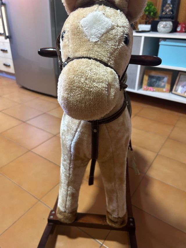 Caballo de peluche para niños, ideal para jugar y montar. - Suave al tacto. - Diseño de caballo marrón con detalles. - Base de madera para balanceo.