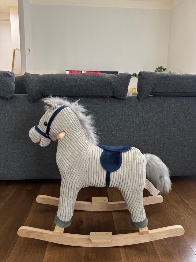 Detalles del productoPrecioso caballo mecedor de la marca Milly Mally, modelo Pony Luna. Es de color gris claro con ribetes azul marino y está en excelentes condiciones.
