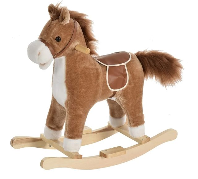 Detalles del productoPrecioso caballo balancín Homcom de madera y peluche de color marrón con montura de cuero sintético. Con Música Relinchos Sonidos de Galope Boca y Cola Móviles 65x32,5x61 cm Marrón