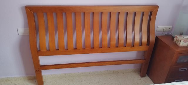Detalles del productoCabecero de madera de pino, para cama de 150 cm. Las medidas son 158 cm de ancho y 107 de alto. Color cerezo oscuro. No se hacen envíos. Medidas del producto