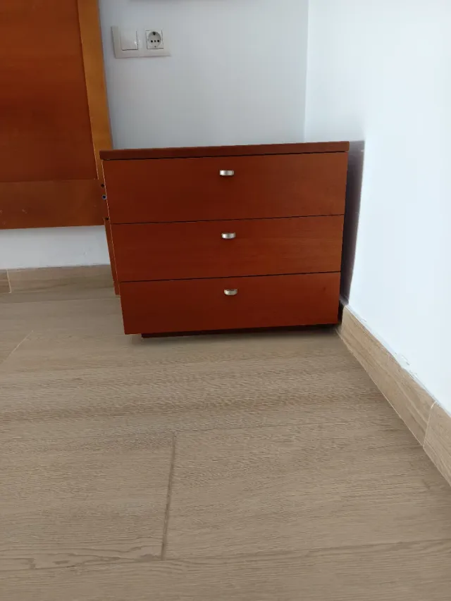 Detalles del productoMueble de dormitorio con tres cajones. Su diseño es de madera y cuenta con tiradores metálicos.