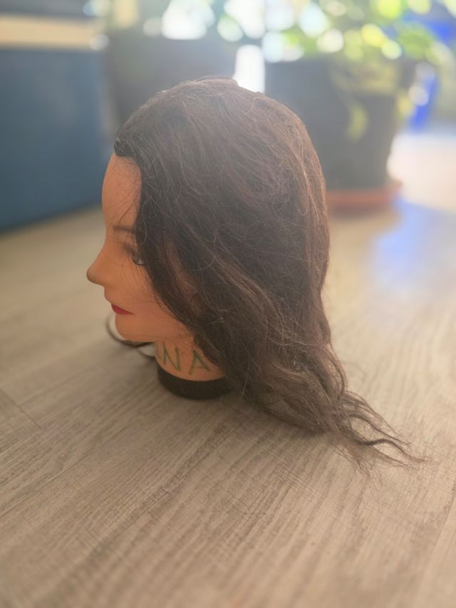 Buen estadoDetalles del productoCabeza de peluquería con cabello largo y castaño. Ideal para practicar peinados, cortes y recogidos.