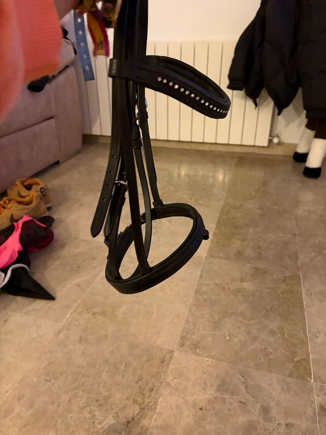 Cabezada de entrenamiento para pony, en perfecto estado. - Color negro. - Diseño con detalles brillantes en la testera. - Incluye todas las riendas y correas.