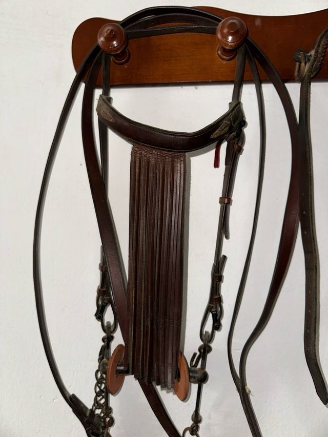 Detalles del productoConjunto de cabezada y bocado de cuero para equitación. Ideal para complementar el equipo de tu caballo.