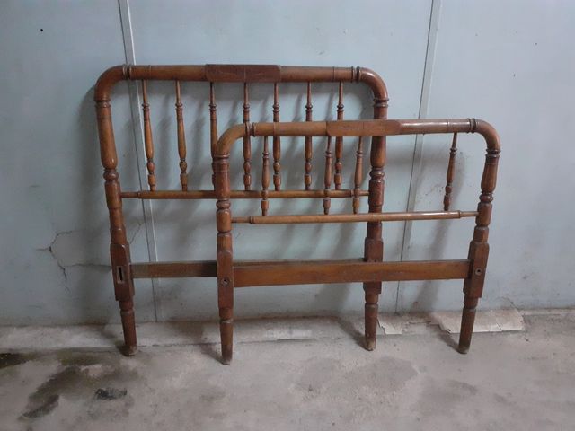 Madera con incisiones, cabezal (117x130x7 cm.), piecero con tres balauatres sueltos