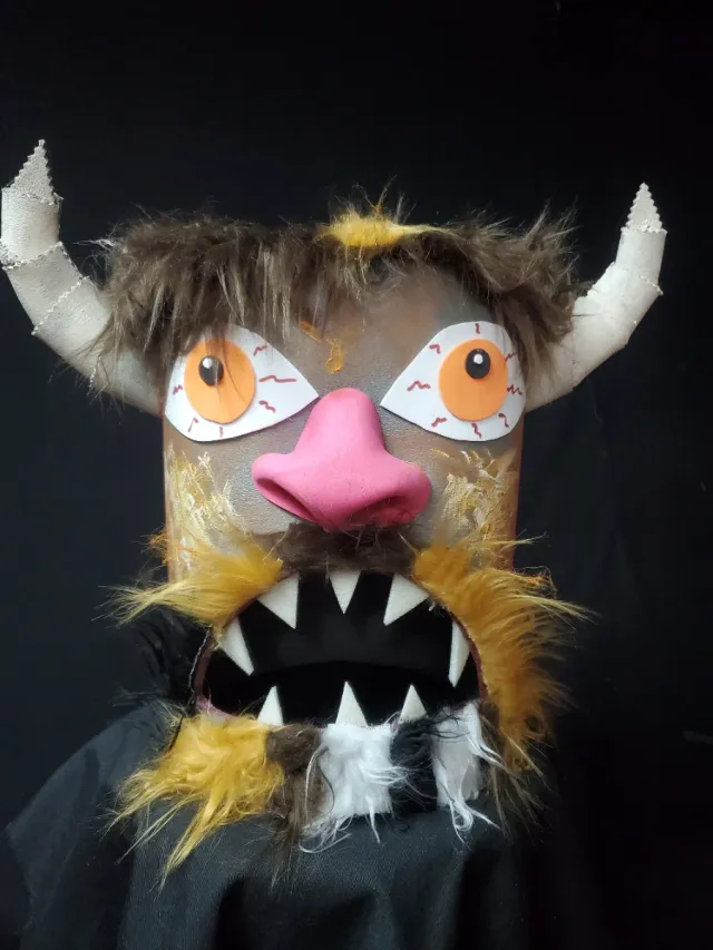 Cabezudo Intxixu, una figura tradicional. - Hecho a mano. - Diseño único con cuernos y pelo. - Nariz rosa y boca con dientes afilados.