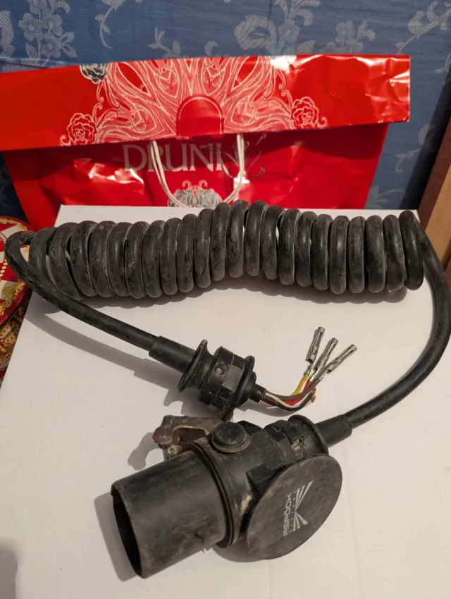 Cable en espiral para remolque con conexión ABS. - Conector de 7 pines. - roto uno de los extremos, para sustituir o conectar directamente al remolque.