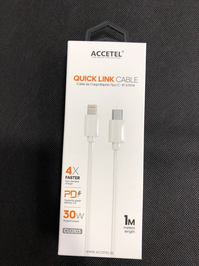 Detalles del productoCable de carga rápida ACCETEL de 1 metro de longitud, con conector Lightning para iPhone y Tipo C.