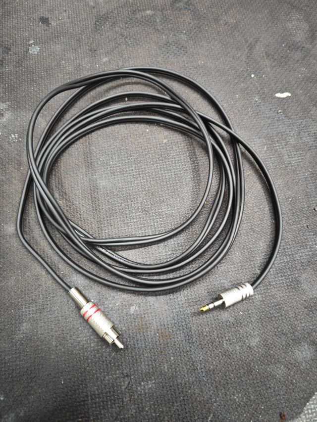 Cable de audio con conector RCA y jack de 3.5mm. - Conector RCA con detalles en rojo y plateado. - Conector jack de 3.5mm con detalles plateados.