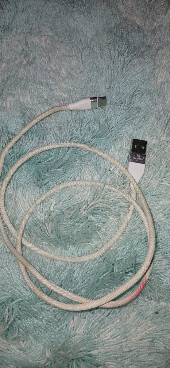 Cable de carga con conector Tipo C. El cable es de color blanco y tiene un acabado trenzado. - Conector USB estándar en un extremo. - Conector Tipo C en el otro extremo.