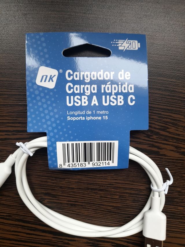 Cable cargador de carga rápida USB A USB C. Longitud 1m. Color blanco. Nuevo precintado.