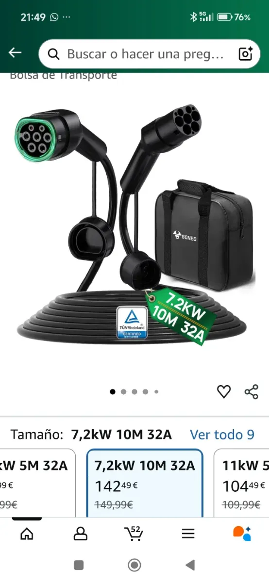Cable de carga para coche eléctrico de 10 metros de longitud y 32A de potencia. - Conector Tipo 2. - Incluye bolsa de transporte. - Certificado TÜV Rheinland.