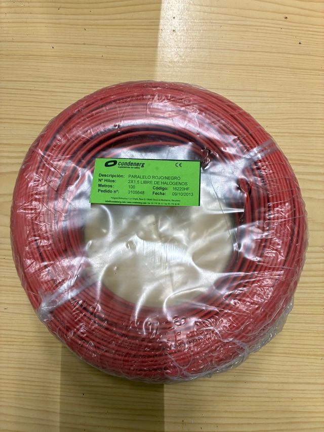 Cable de la marca Condener, modelo paralelo rojo/negro. - Longitud: 100 metros. - Sección: 2x1,5 mm². - Libre de halógenos. - Código: 16220HF.