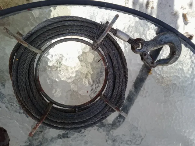Cable de acero enrollado con un gancho metálico. - Cable de acero trenzado. - Gancho de remolque. - Diámetro aproximado del cable: 1 cm.