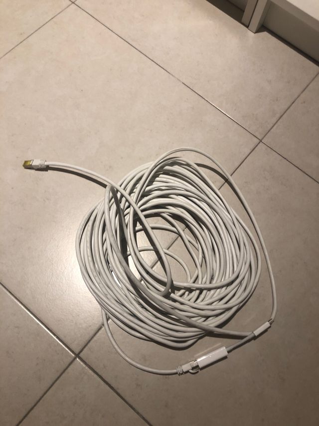 Cable de red blanco con un conector Ethernet y otro conector compatible con Apple. - Cable de red blanco. - Conector Ethernet.