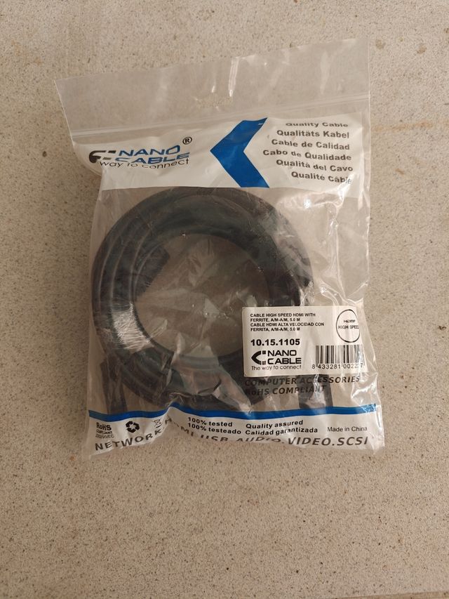 Cable HDMI de alta velocidad con ferrita. - Longitud: 5 metros. - Conectores: A/M-A/M. - Certificación RoHS compliant. - Fabricado en China.