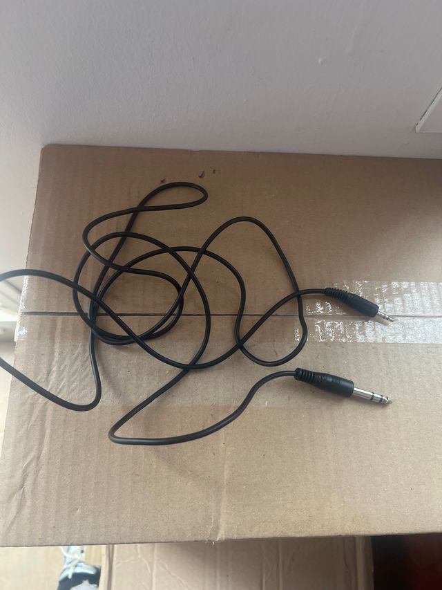 Cable de conexión con dos extremos. - Un extremo es un conector minijack (3.5mm). - El otro extremo es un conector jack (6.35mm). - Longitud aproximada de 1.5 metros.