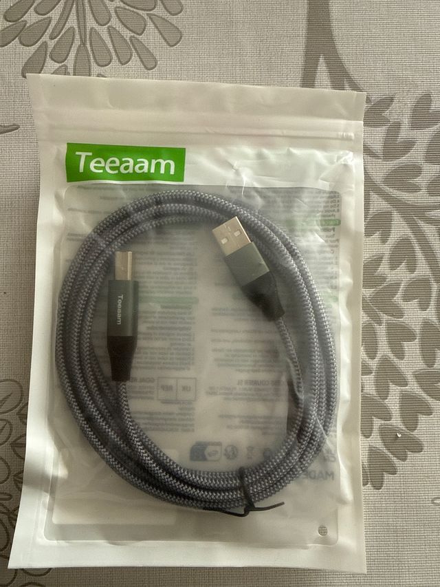 Cable de carga y datos de la marca Teeam. Conector USB-C en un extremo y USB-A en el otro. - Cable trenzado de color gris. - Conector USB-C. - Conector USB-A.