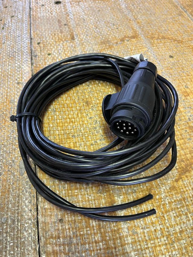 Detalles del productoCableado de conexión para remolque con conector de 13 pines. El cable es de color negro y cinco metros de largo.