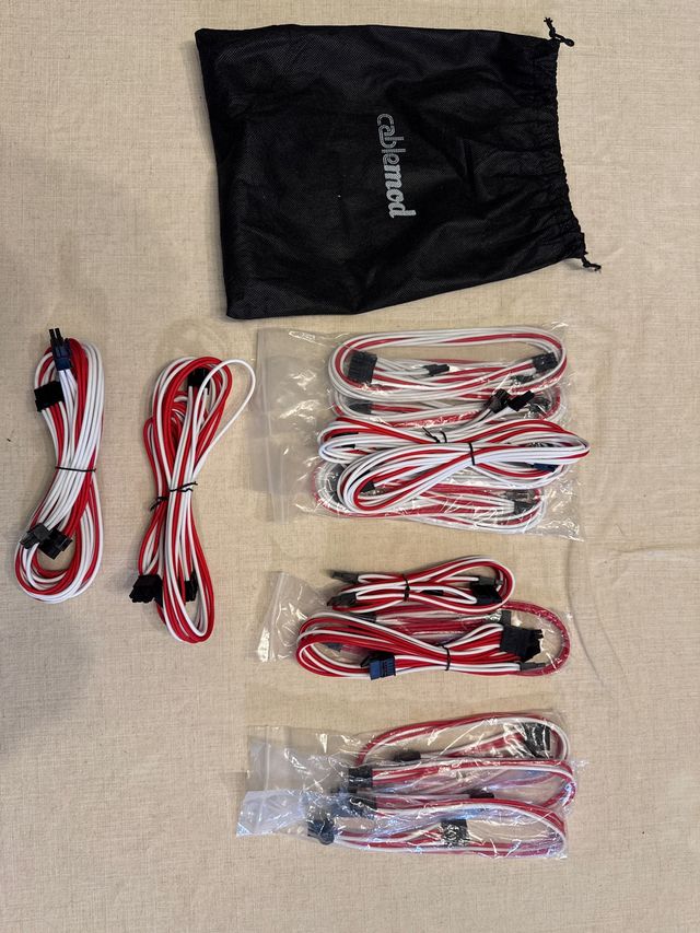 Detalles del productoCables tipo 3 de color blanco y rojo para fuentes de alimentacion Corsair, impecables, listos para usar. Incluye la bolsa para almacenarlos.
