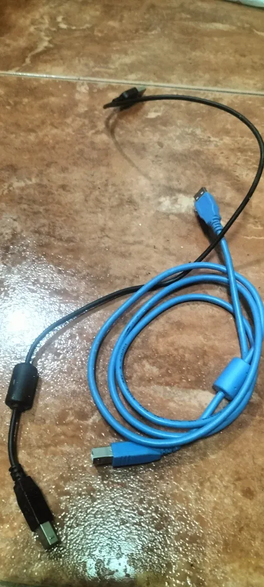 Dos cables USB de diferentes colores. USB 3.0 tipo B, que se utiliza comúnmente para conectar impresoras, escáneres o discos duros externos a un ordenador
