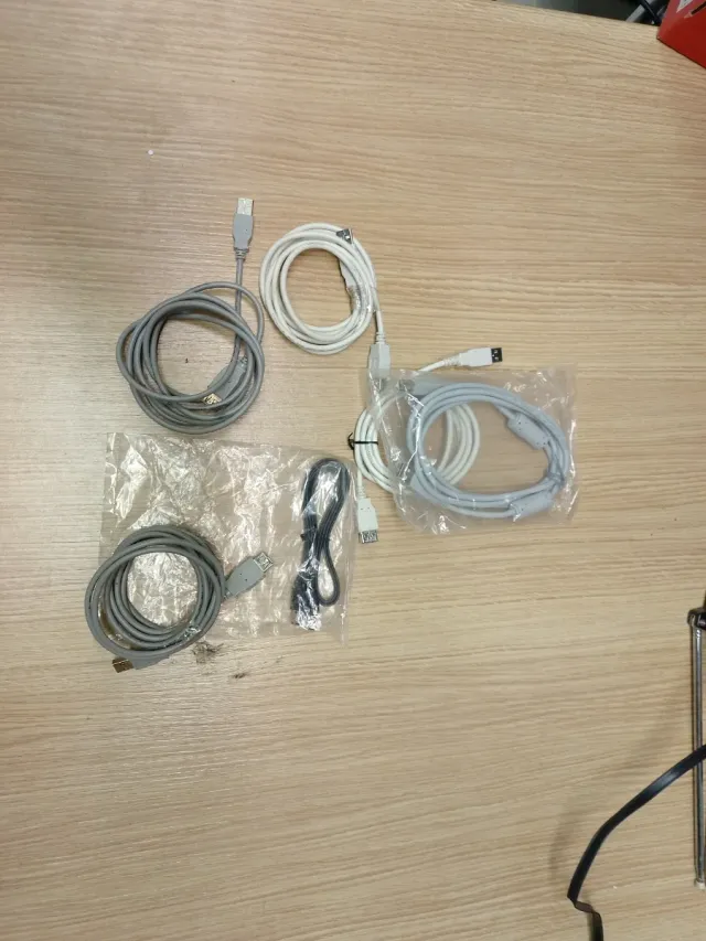 Lote de cables USB de diferentes tipos y colores. - Cable USB gris enrollado. - Cable USB blanco enrollado. - Cable USB blanco en bolsa. - Cable USB negro en bolsa.