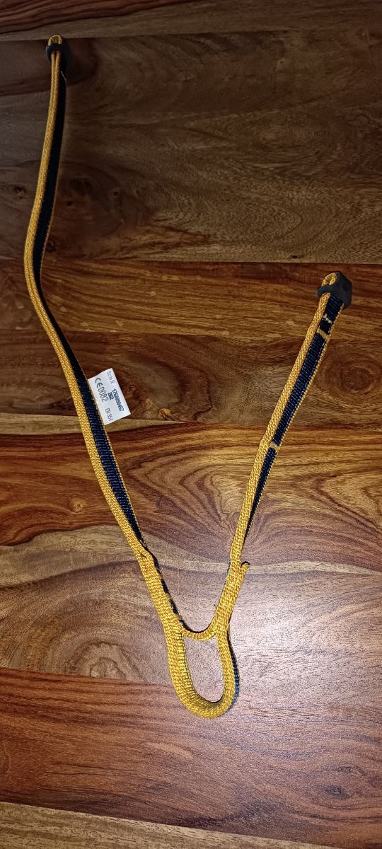 Cabo de anclaje doble de la marca PELTZ. Es de color amarillo con detalles en azul. - Usado una vez. - Certificación CE 0082. - Cumple la norma EN 354.